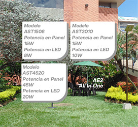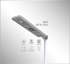 AE2- Aplicaciones bajo tráfico AE2- Aplicaciones bajo tráfico La serie AE2 con todos sus componentes y sensor de movimiento dentro de un atractivo y diseño compacto, no solo ahorra más energía sino también mejora la eficiencia lumínica, al contar con batería litio Life Po4 y material resistente a la corrosión. Aplicaciones en: Parcelación Campestre Océano Verde Imagénes