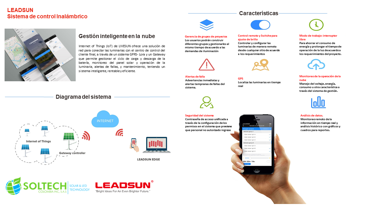 Toda la gama de Leadsun ofrece la función de operar y controlar los sistemas a distancia, algo novedoso y de gran utilidad. Para ello utiliza una gama de tecnologías de conexión inalámbrica como Bluetooth o WiFi para conectarse de forma segura cada dispositivo. Por otro lado, Leadsun ha incorporado lo último en redes “Meshnetworking” para proporcionar una conectividad entre todos los sistemas de luz solar y a la que puede accederse a distancia a través de tecnología GPRS o 433.